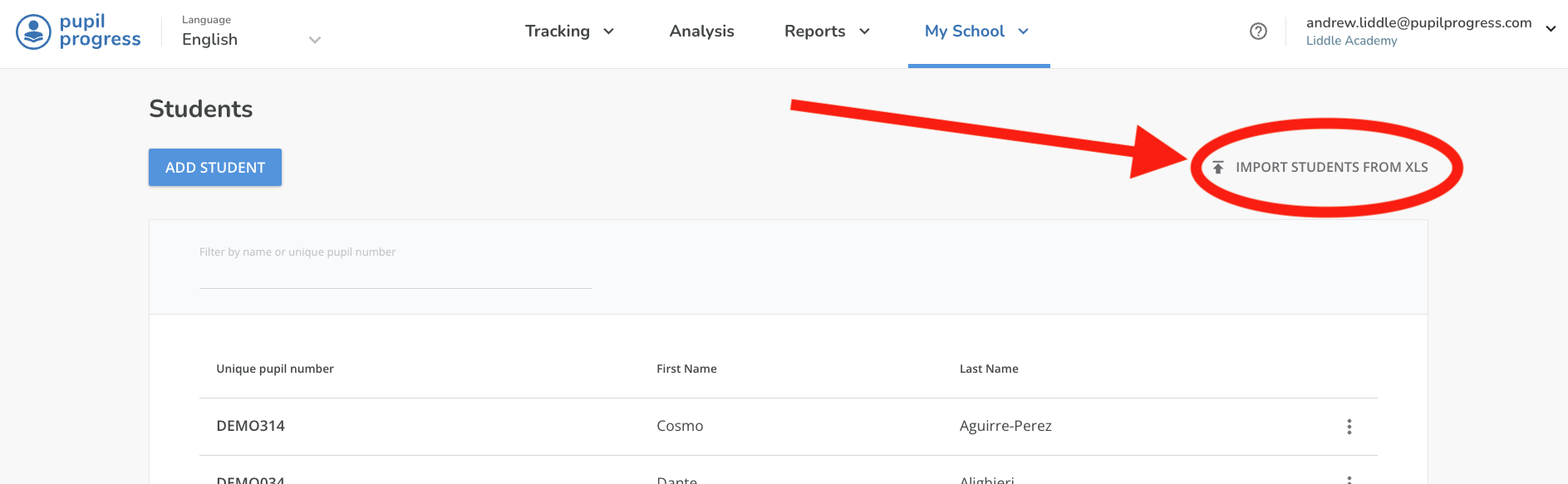 Once you've entered all your students' details on the template, save the file and then click on Upload import file.