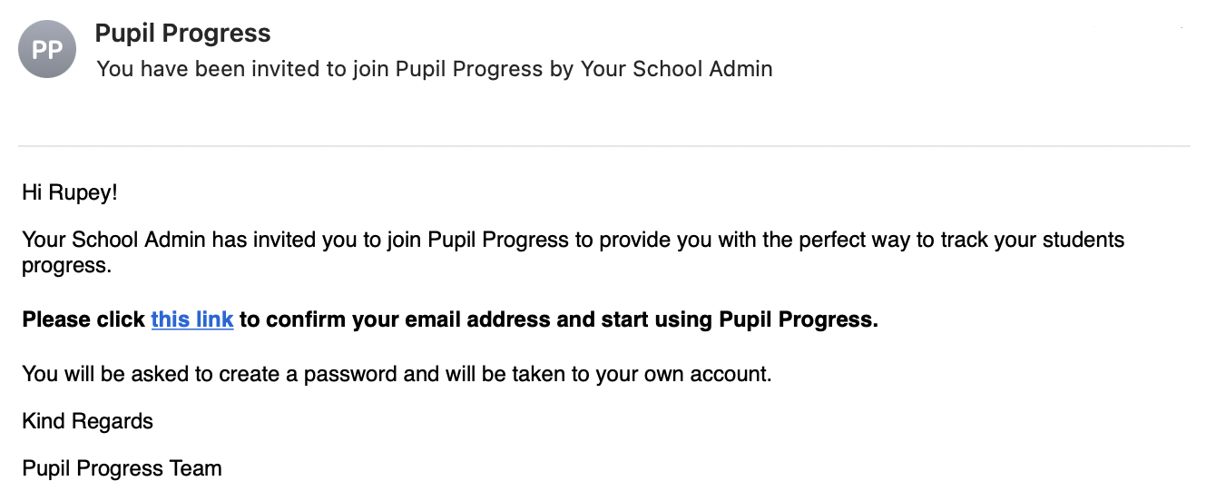 Once you have done this, the staff member will receive an email within a couple of minutes inviting them to sign up to Pupil Progress; they just need to click the link, create a password, and then they're in!