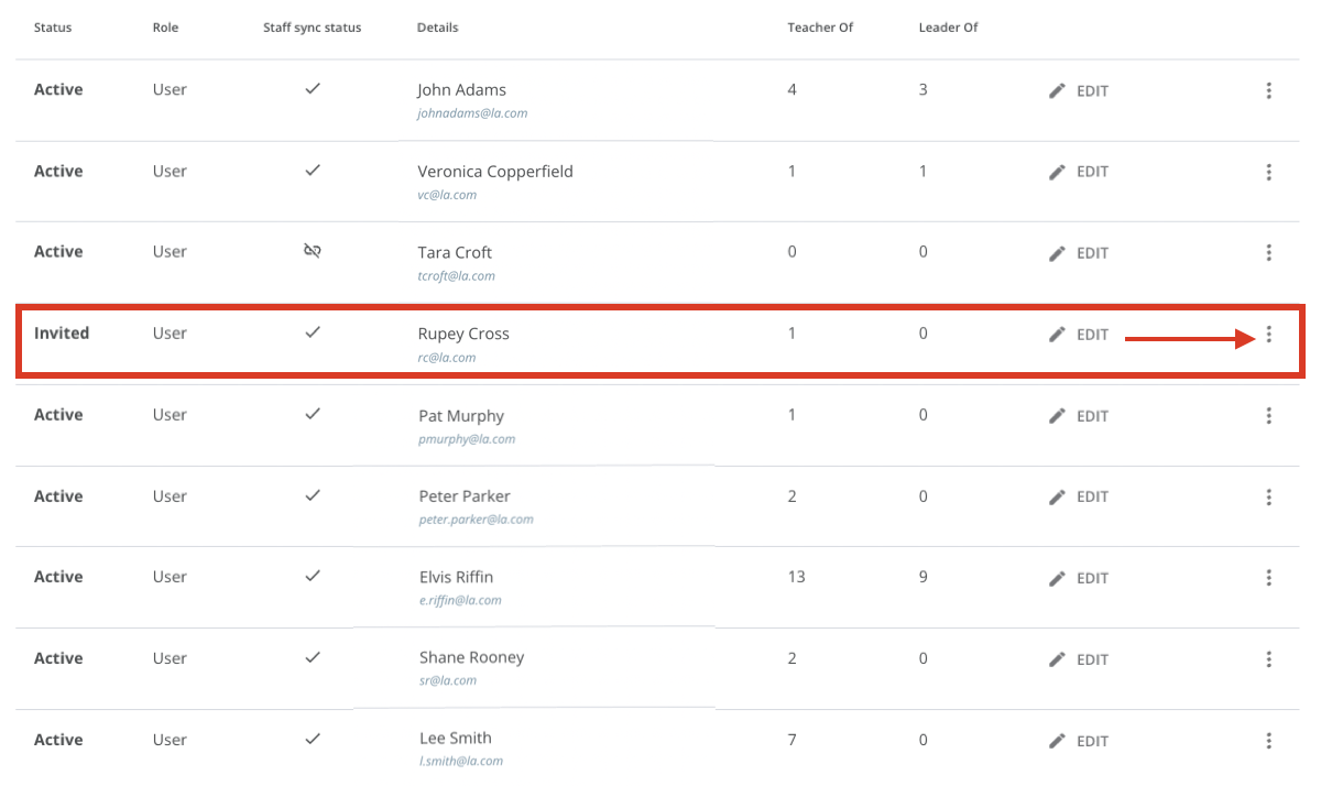 Groupcall syncs regularly, meaning that they should appear in the list of staff under the My School area soon after the are added to your MIS. Please note, it can take up to a day for this sync to occur. Once they appear, their status will be set to either Invited or Not invited yet, meaning that you just need to click the three dots to the right hand side of their name and select the Send Invitation Email option from the box that pops up.