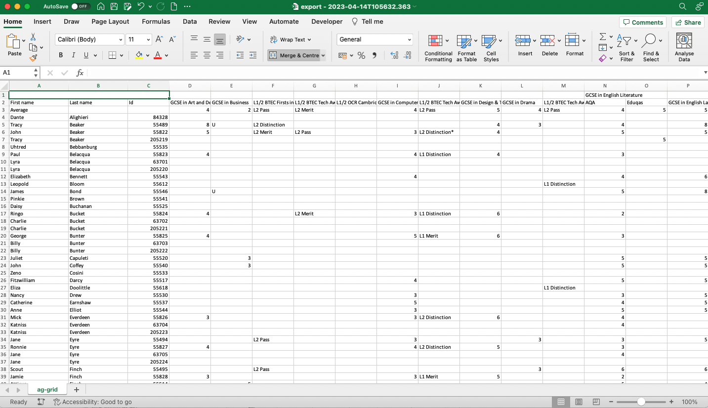 Once you've got the file, you'll need to head over to Arbor to download a copy of their import spreadsheet. To do this, go to Students -> Assessments -> Summative Tracking -> Mark Entry -> Import from the left hand menu, however we'd recommend taking a look on Arbor's own help centre for the full info on how to download the file that fits your needs. You're able to find a link to the page here -> Arbor | Using the assessment import spreadsheet . This will then download a similar looking Excel file where you can paste in your Pupil Progress data (or use a =Match/Lookup function if you're an Excel whiz!).